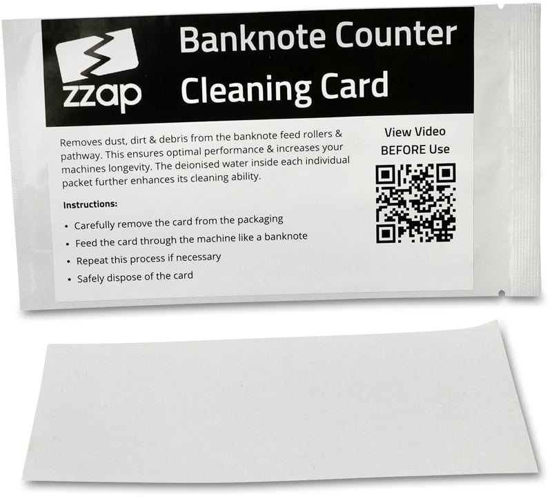 Keep your banknote counters running smoothly with ZZap banknote counter cleaning cards. These specially designed cards remove dust, dirt, and debris from internal sensors and rollers, ensuring accurate counting and preventing jams. Regular use helps maintain machine efficiency, reduces sensor errors, and extends equipment lifespan. Simply run the card through your banknote counter like a regular banknote for fast and effective cleaning.